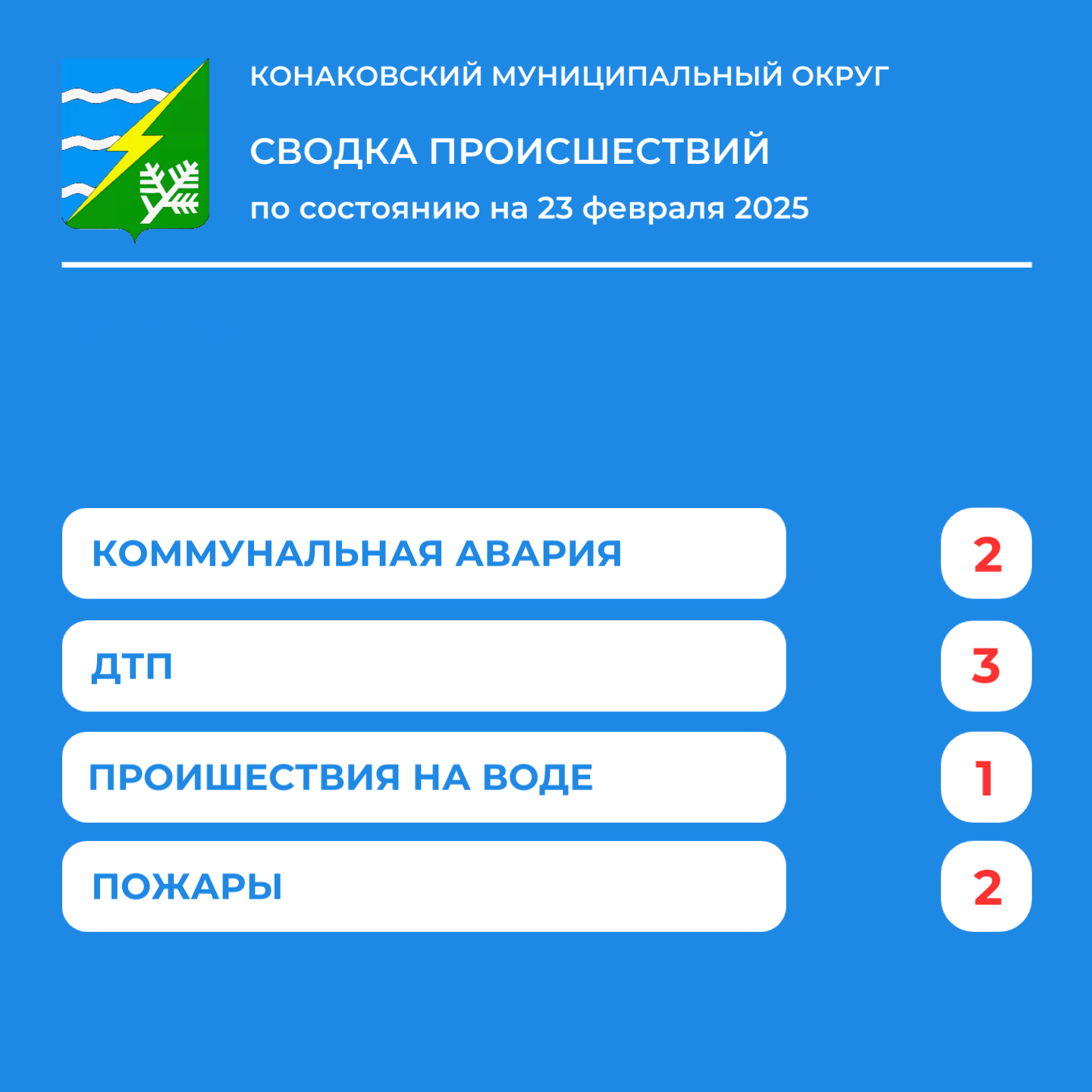 По сообщению единой дежурной диспетчерской службы Конаковского муниципального округа, за прошедшую неделю с 17 по 23 февраля в округе произошло 2 пожара, 2 аварии на объектах ЖКХ, 1 происшествие на воде и 3 ДТП.