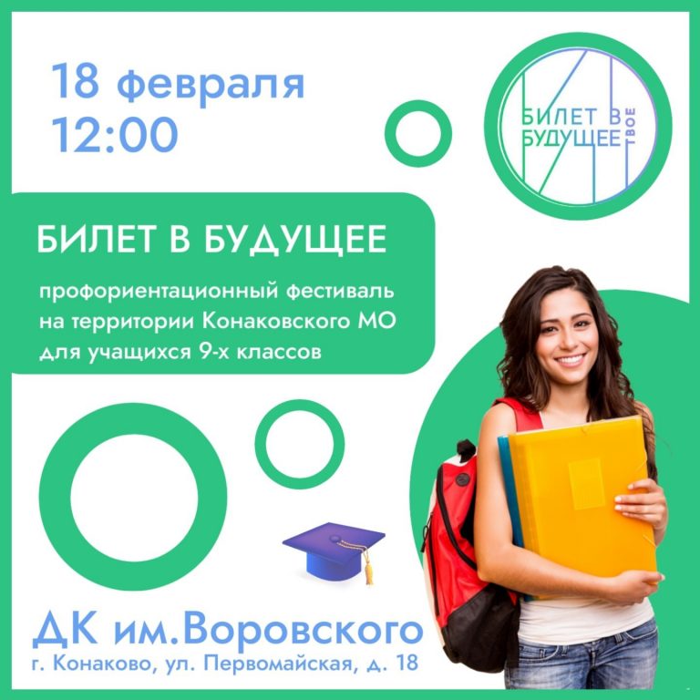 Профориентационный фестиваль «Билет в будущее» на территории Конаковского муниципального округа для учащихся 9-х классов пройдет 18 февраля 2025 года на базе ДК им Воровского. Начало в 12.00.