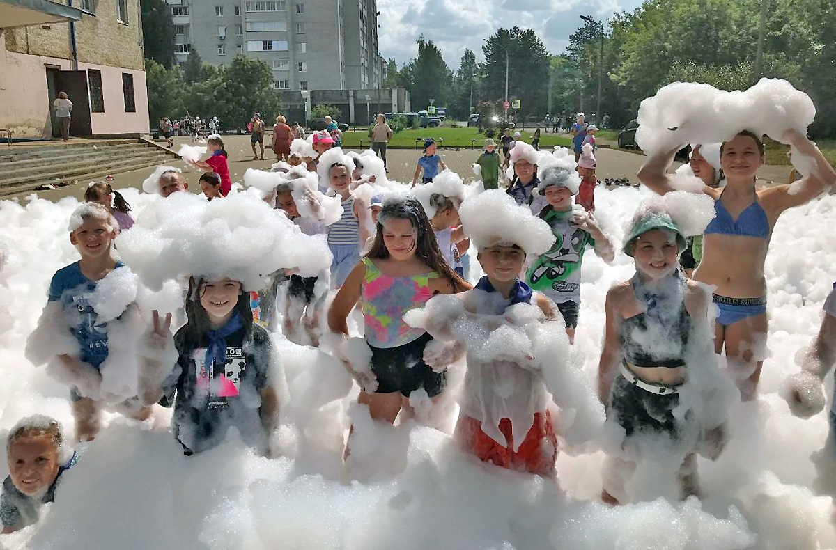 Жаркий июль не обошёлся без водных развлечений! 24 июля «День Нептуна» превратил площадь Дворца культуры в морское царство с играми, брызгами и водными эстафетами. А 28 июля ребят ждало ещё больше веселья — «Пенная вечеринка» с гигантской пушкой засыпала всю площадь пушистыми хлопьями, в которых ребята с радостью кувыркались и лепили снежные бороды — посреди жаркого лета!