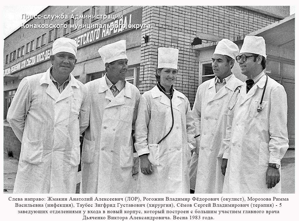 В то время в Конаковской ЦРБ хирургией заведовал известный военный хирург Сергей Алексеевич Смирнов, главным врачом был Виктор Александрович Дьяченко, хирург, прошедший войну. Он очень много сделал для развития больницы, отделений.