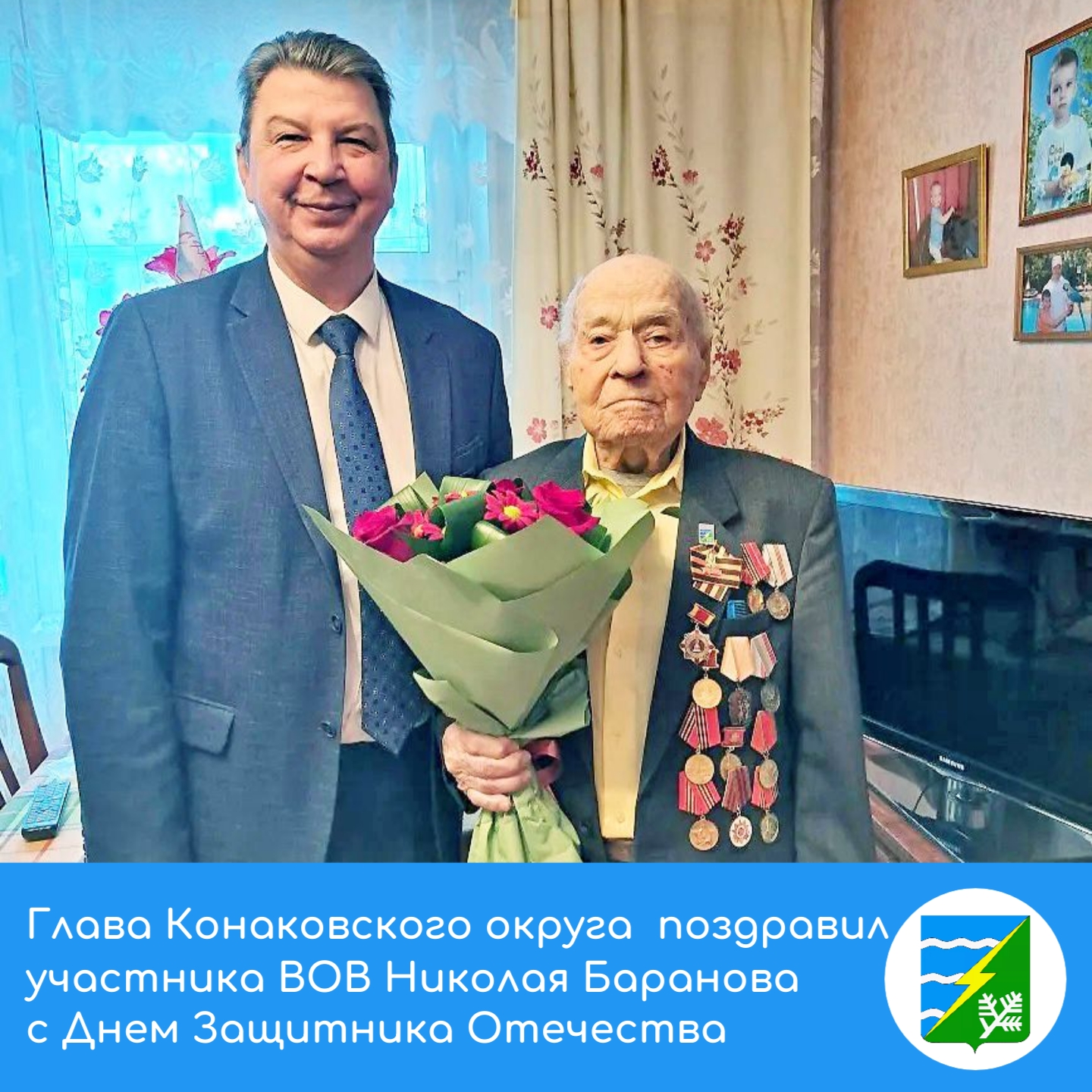 Глава Конаковского округа Алексей Пляскин поздравил участника Великой Отечественной войны Николая Федоровича Баранова с наступающим Днем защитника Отечества. Он пожелал ветерану крепкого здоровья, оптимизма и активности, заботливых и любящих людей вокруг.