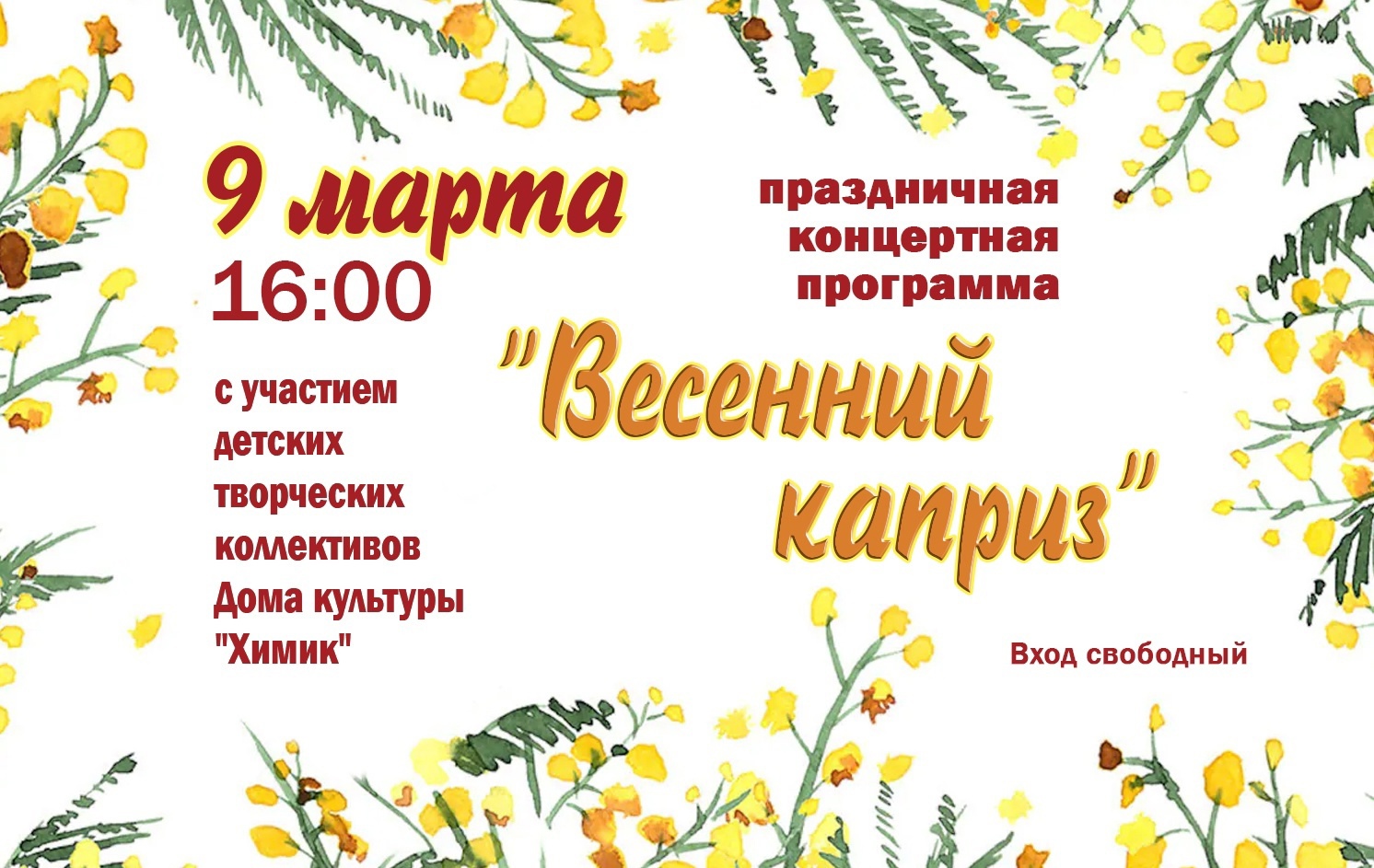 — Праздничная концертная программа «Весенний каприз». ДК «Химик» п. Редкино. Начало в 16:00.