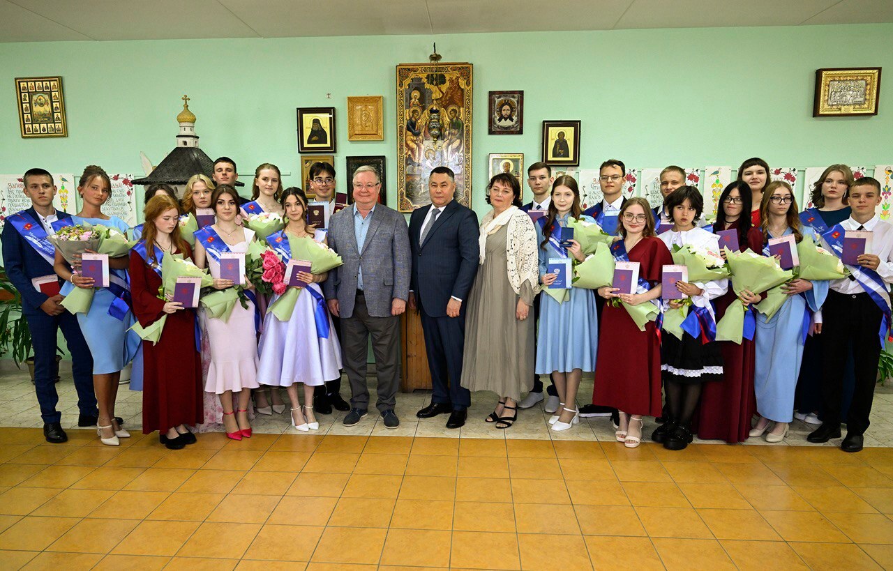 Также Губернатор Игорь Руденя и председатель попечительского совета Фонда развития территорий Сергей Степашин вручили аттестаты выпускникам Городенской православной гимназии имени протоиерея Алексия Злобина. Игорь Михайлович пожелал воспитанникам гимназии, чтобы они, как и отец Алексий, так же были счастливы, всеми любимы, уважаемы, сделали многое для нашей страны, области, своих близких. Потому что главная задача любого человека – делать добро, и очень важно это делать своим трудом.