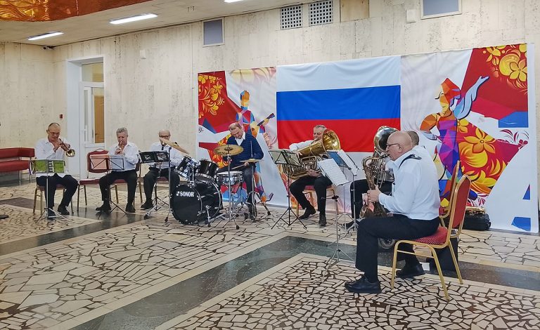 Перед началом концерта в фойе состоялось выступление духового оркестра «Наше время», создавшее праздничную атмосферу и настроившее зрителей на предстоящее мероприятие.