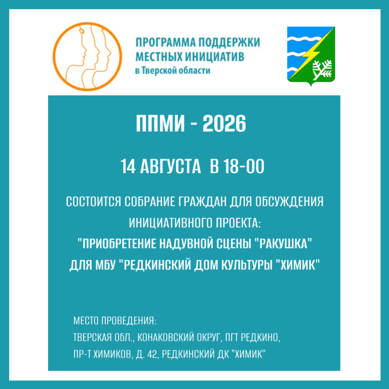 Инициативная группа, созданная для реализации инициативного проекта «Приобретение надувной сцены «Ракушка» для МБУ «Редкинский Дом культуры «Химик» информирует о проведении собрания граждан, которое состоится 14 августа 2025 года в 18:00.