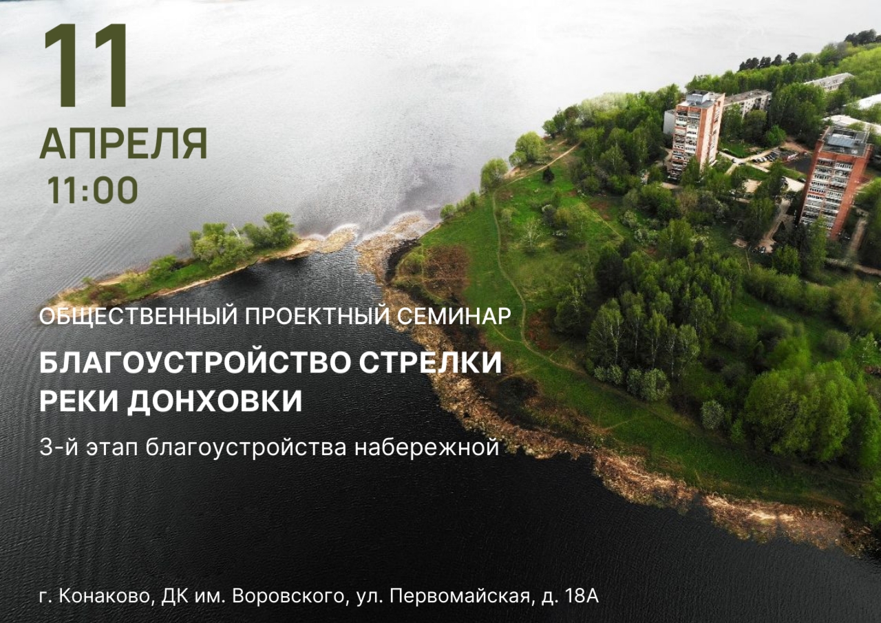 Тема семинара — проект благоустройства для стрелки реки Донховка (3 этап благоустройства набережной, продолжение в сторону центрального моста). Проектный семинар пройдет в ДК им. Воровского, по адресу: г. Конаково, ул. Первомайская, д. 18А. Всю необходимую информацию по проекту вы сможете получить на семинаре. Вход свободный.