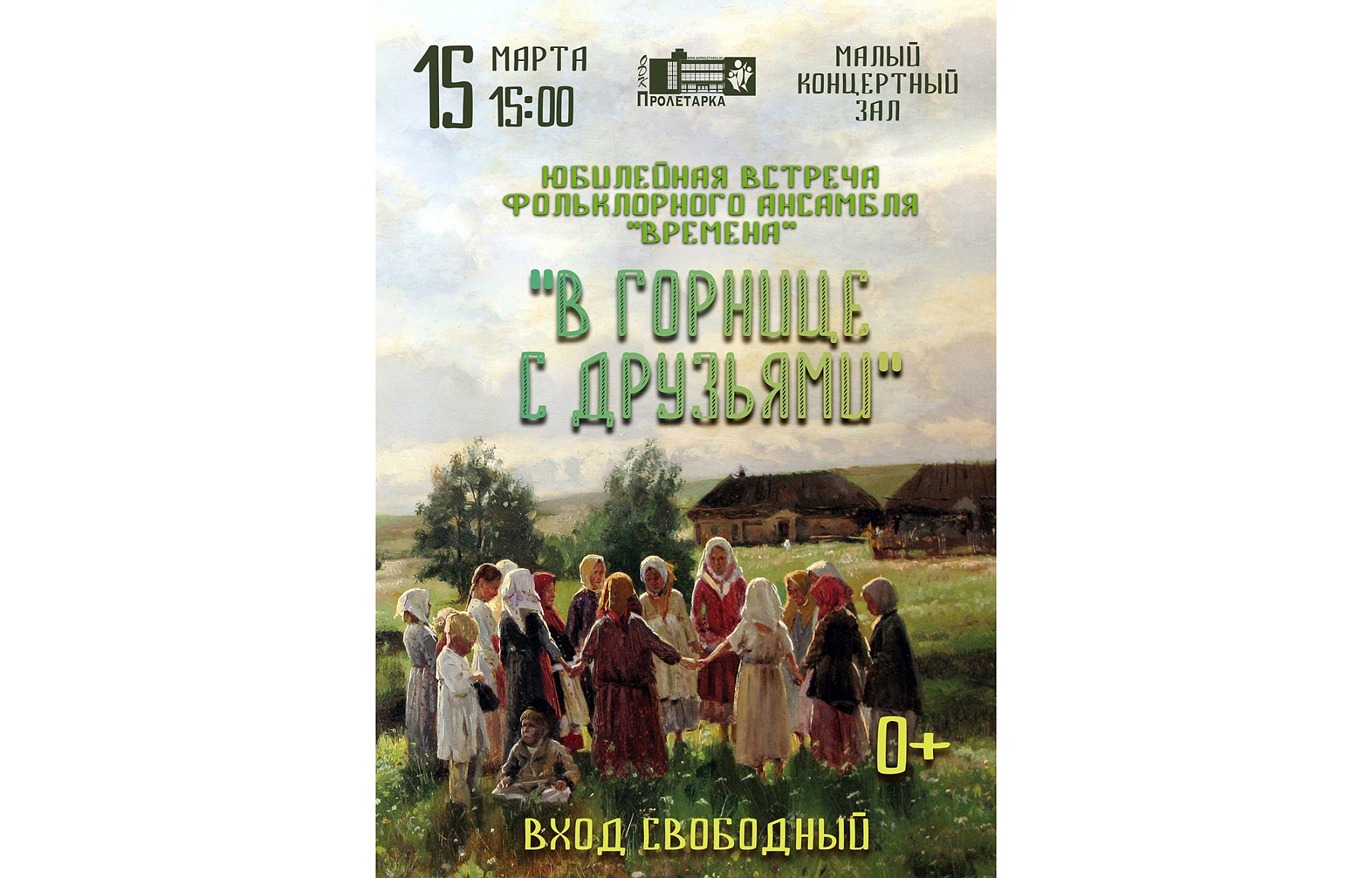 15 марта в 15.00 фольклорный ансамбль «Времена» в честь своего 10-летнего юбилея проведёт творческую встречу «В горнице с друзьями» (0+). Под звуки старинных инструментов, в формате музыкально-театрализованной постановки, зрители смогут погрузиться в творческую атмосферу фольклорного наследия.