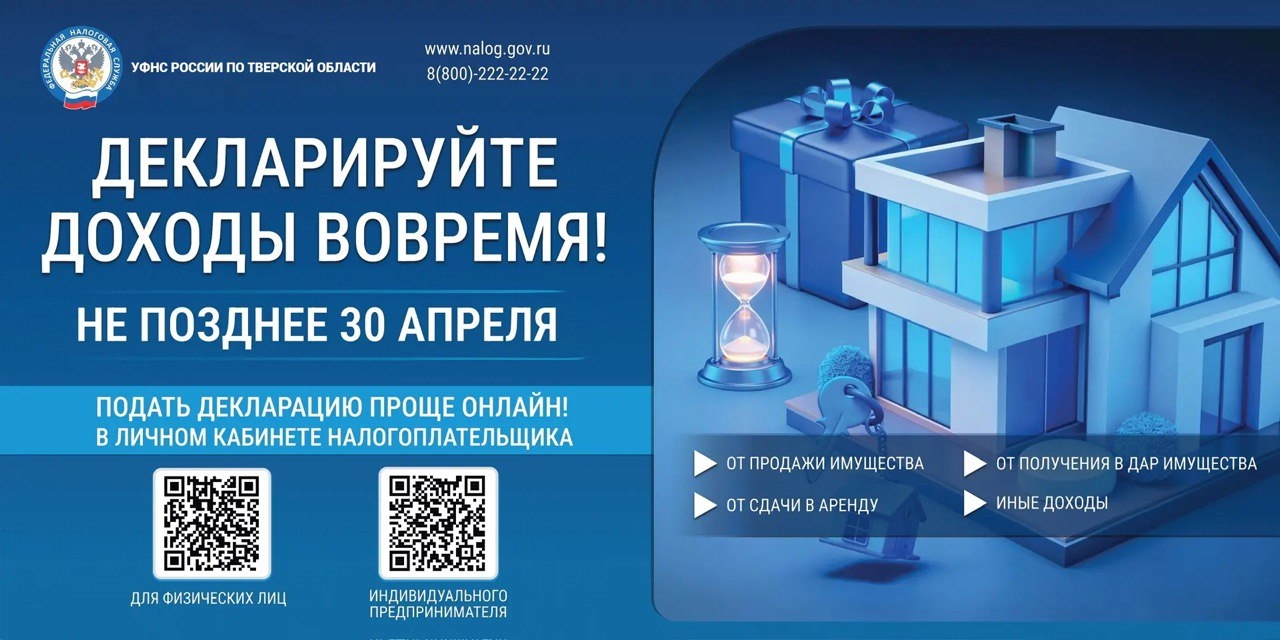 Управление Федеральной налоговой службы по Тверской области информирует, что 1 января 2026 года стартовала ежегодная декларационная компания по налогу на доходы физических лиц, в ходе которой налогоплательщики в срок до 30 апреля 2026 года должны отчитаться о доходах, полученных в 2025 году.