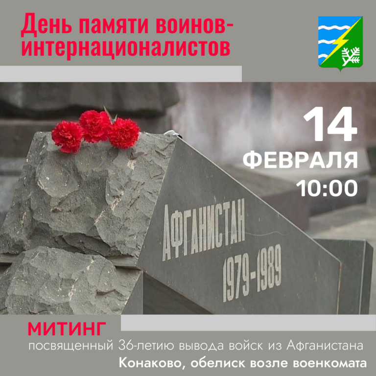 Уважаемые жители г. Конаково и Конаковского муниципального округа!14 февраля у обелиска перед Конаковским ГВК (ул. Свободы, 132) состоится митинг, посвященный 36-летию вывода советских войск из Афганистана. Начало в 10.00. 6+ Если вы нашли ошибку, пожалуйста, выделите фрагмент текста и нажмите Ctrl+Enter. 00