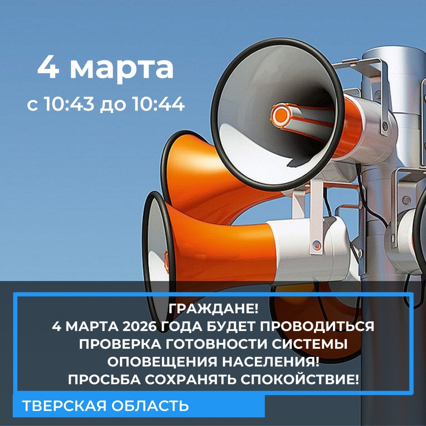 На территории Тверской области 4 марта 2026 г. с 10.43 до 10.44 будет проводиться проверка региональной автоматизированной системы централизованного оповещения населения.