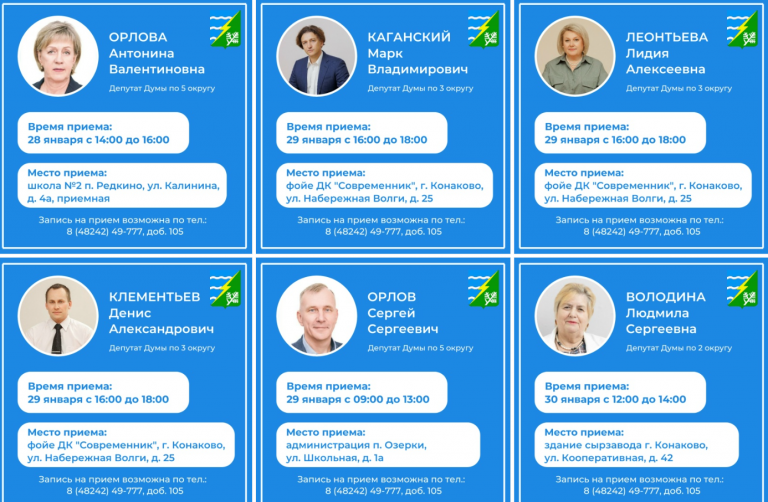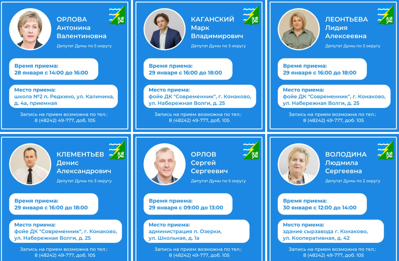 28, 29 и 30 января проведут личный прием граждан депутаты Думы Конаковского муниципального округа. Запись на прием возможна по телефону: 8 (48242) 49-777, доб. 105.
