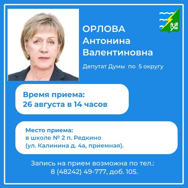 26 августа с 14 до 16 часов проведет личный прием граждан Депутат Думы Конаковского муниципального округа, член постоянной депутатской комиссии Думы по финансовым и экономическим вопросам Орлова Антонина Валентиновна. Прием состоится в школе № 2 п. Редкино (ул. Калинина д. 4а, приемная).