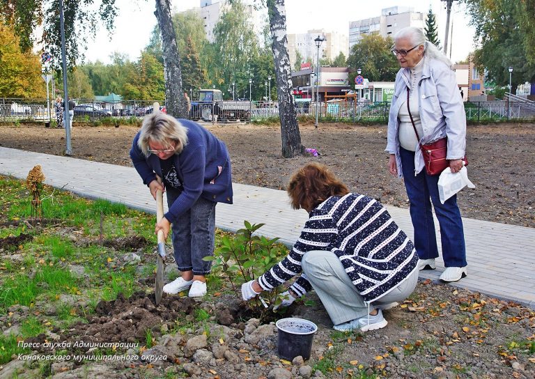 Завершаются работы второго этапа реконструкции центральной городской площади в Конаково, идет приемка объекта. В рамках работ по озеленению специалисты Управления территориями Конаковского округа и МБУ «Коммунальное хозяйство» вновь произвели высадку саженцев сирени и гортензии из питомника. В этом им помогли жители города. Помимо посаженных растений также произведен засев газонной травой.