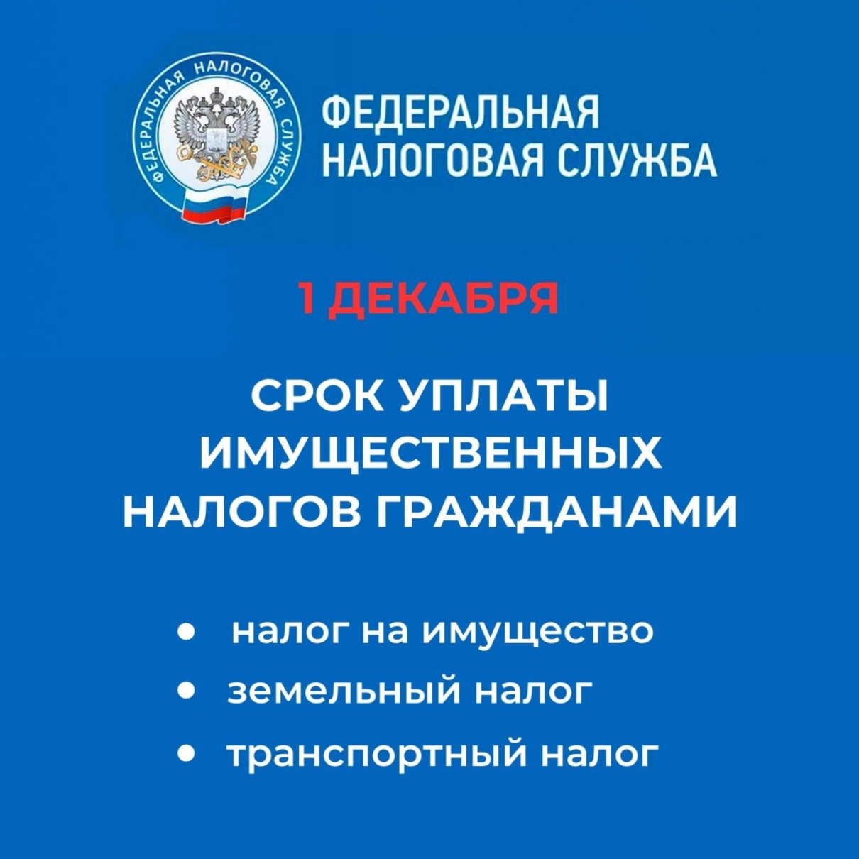 Уважаемые жители Конаковского округа! Управление федеральной налоговой службы России по Тверской области, в рамках проведения ежегодной налоговой кампании, уведомляет о соблюдении уплаты физическими лицами имущественных налогов (земельного, транспортного, налога на имущество физических лиц) за 2024 год в срок до 1 декабря 2025 года (включительно).