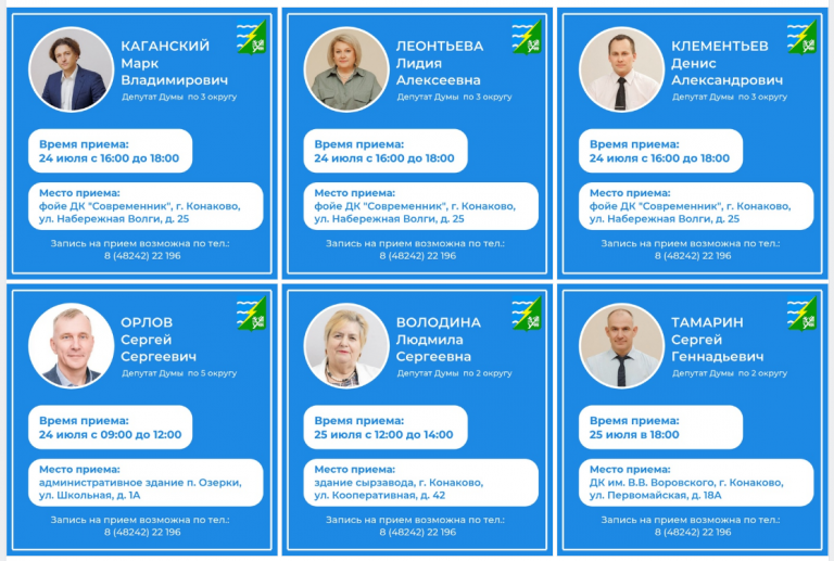 25 июля с 12:00 до 14:00 проведет прием граждан депутат Думы по 2 округу Володина Людмила Сергеевна, член депутатского объединения Всероссийской политической партии «Единая Россия», член постоянной депутатской комиссии Думы по финансовым и экономическим вопросам, член постоянной депутатской комиссии Думы по имущественным и земельным отношениям. Прием состоится по адресу: здание сырзавода г. Конаково, ул. Кооперативная, д. 42.