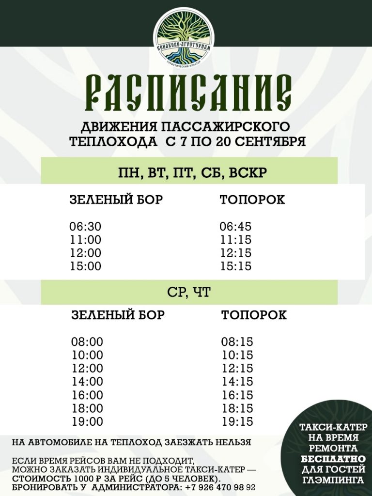 В это время пассажирская переправа «Зелёный Бор» — «Топорок» будет работать на теплоходе «Юриг», на автомобиле на него будет заезжать нельзя. Машину можно оставить на берегу у паромной переправы «Зелёный Бор». Расписание движения парома с 7 по 20 сентября предлагается посмотреть в карточке.