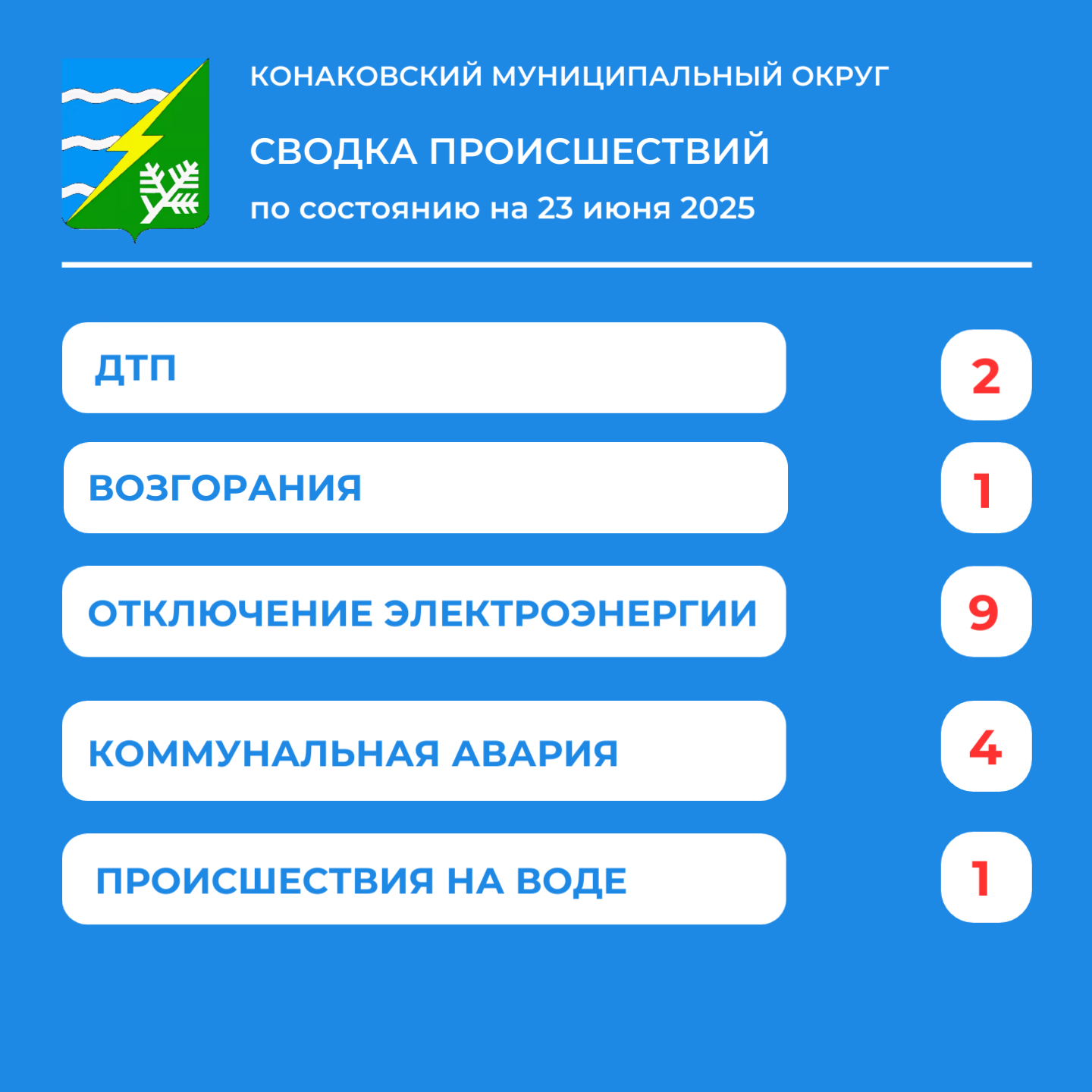 По информации Единой дежурной диспетчерской службы (ЕДДС) Конаковского муниципального округа, с 16 по 22 июня на территории округа произошло 9 отключений электроэнергии, 2 ДТП, 1 пожар, 4 коммунальных аварии, 1 происшествие на воде. Информация актуальна на 8.00 23.06.2025 г.