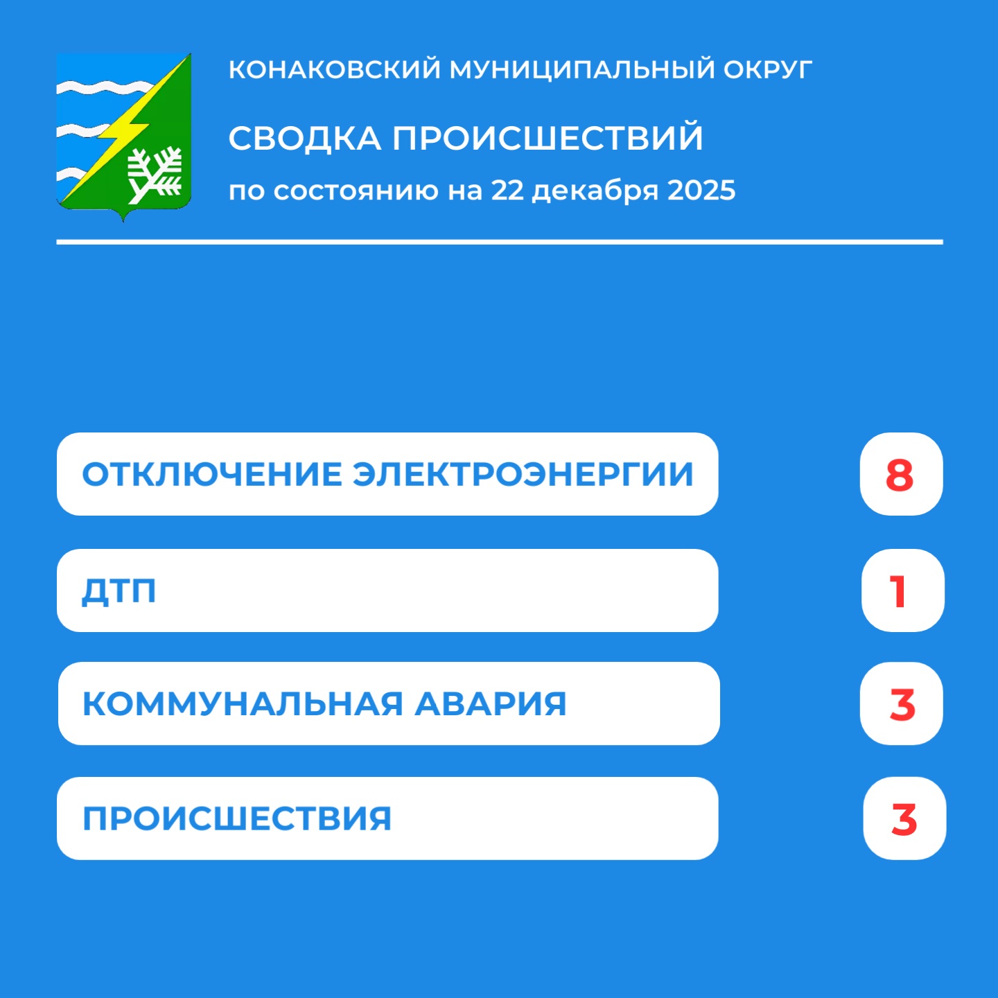 По информации Единой дежурной диспетчерской службы (ЕДДС) Конаковского муниципального округа, с 15 по 21 декабря 2025 г. в округе произошло 8 аварийных отключений электроснабжения, 3 аварии на объектах ЖКХ, 1 ДТП, 3 прочих происшествия (одно с несовершеннолетним).
