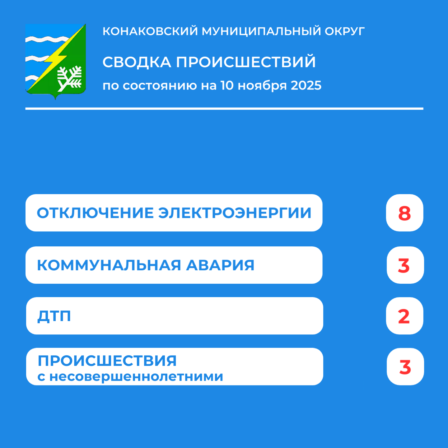 По информации Единой дежурной диспетчерской службы Конаковского муниципального округа, за период с 3 по 9 ноября 2025 года в округе произошло 9 аварийных отключений электроэнергии, 3 аварии на объектах ЖКХ, 2 дорожно-транспортных происшествия и 3 происшествия с несовершеннолетними.