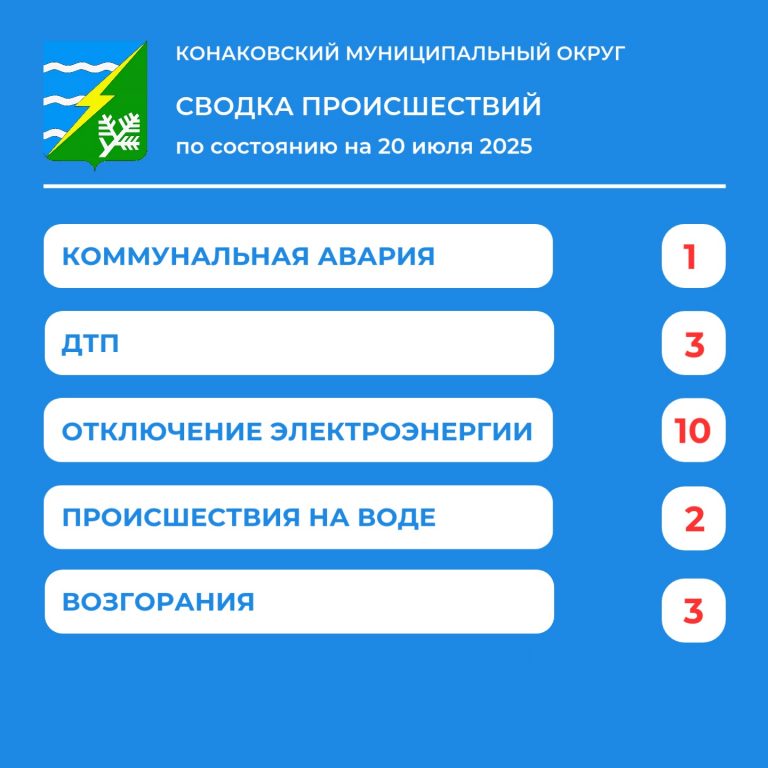 С 14 по 20 июля в Конаковском муниципальном округе произошло 10 отключений электроэнергии, 1 коммунальная авария, 3 возгорания, 3 ДТП, 2 происшествия на воде. Информация актуальна на О8:00 21 июля 2025 года. Предоставила ее ЕДДС Конаковского округа.