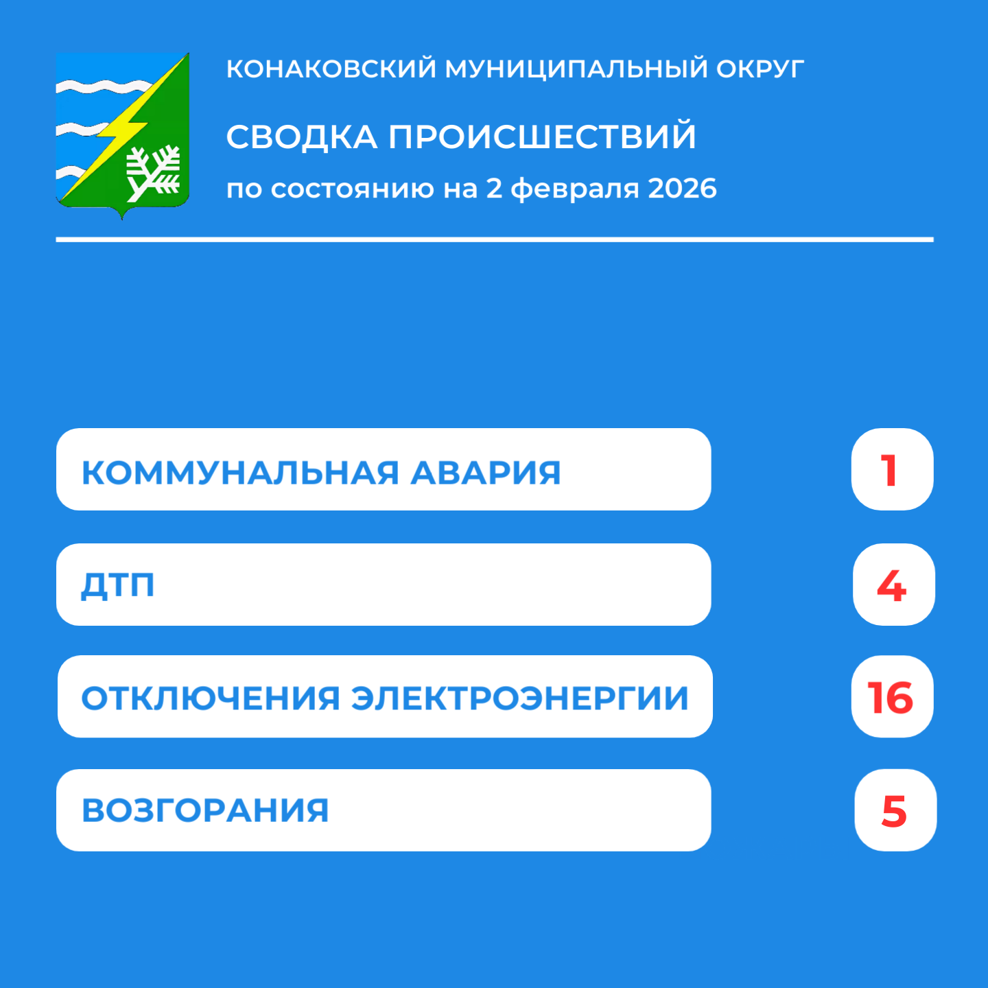 По информации Единой дежурной диспетчерской службы (ЕДДС) Конаковского муниципального округа, за прошедшую неделю с 26 января по 1 февраля 2026 года в округе произошло: 16 аварийных отключений электроснабжения, поступило 265 заявок на чистку снега, случилось 5 пожаров (пострадавших нет), 1 коммунальная авария и 4 ДТП (3 погибших). Информация актуальна на 8:00 2 февраля 2026 г.