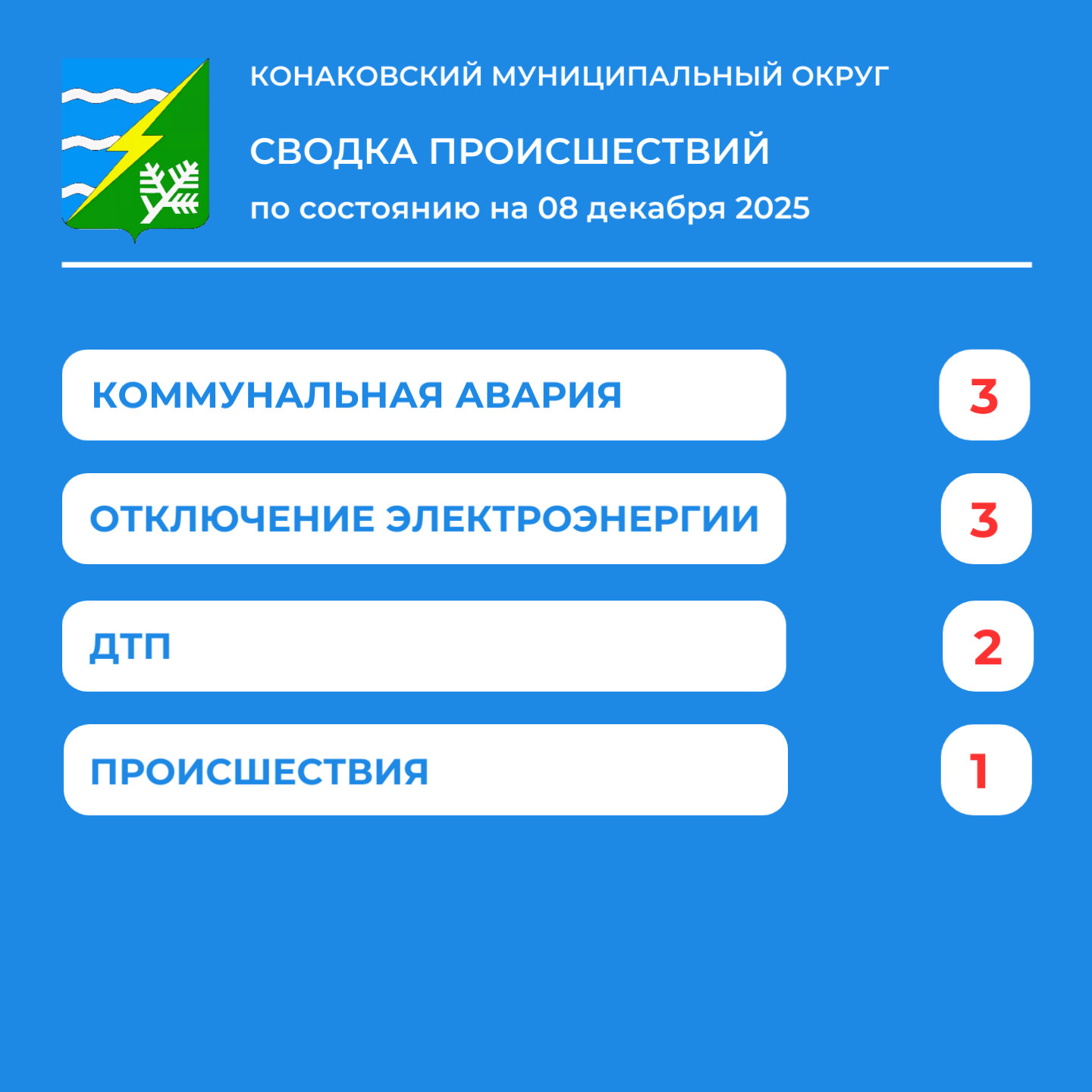 По информации Единой дежурной диспетчерской службы (ЕДДС) Конаковского муниципального округа, за период с 1 по 7 декабря 2025 года в округе произошло 3 аварийных отключения электроэнергии, 3 аварии на объектах ЖКХ, 2 ДТП и 1 обнаружение подозрительного предмета. Информация актуальна на 8:00 8.12.2025 г.