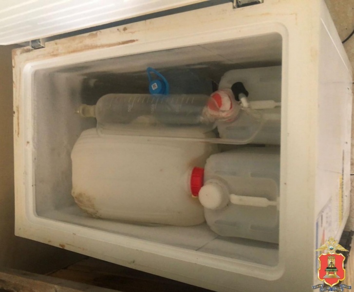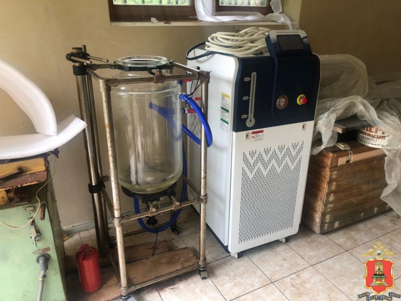 В ходе обследования дома, гаража и придомовой территории участка полицейские обнаружили и изъяли 2 химических реактора, увлажнитель, индукционную плату, электронный термометр, мерные стаканы и делительные воронки, контейнер и металлическую бочку, а также 16 канистр с жидкостями общим объёмом около 180 литров.