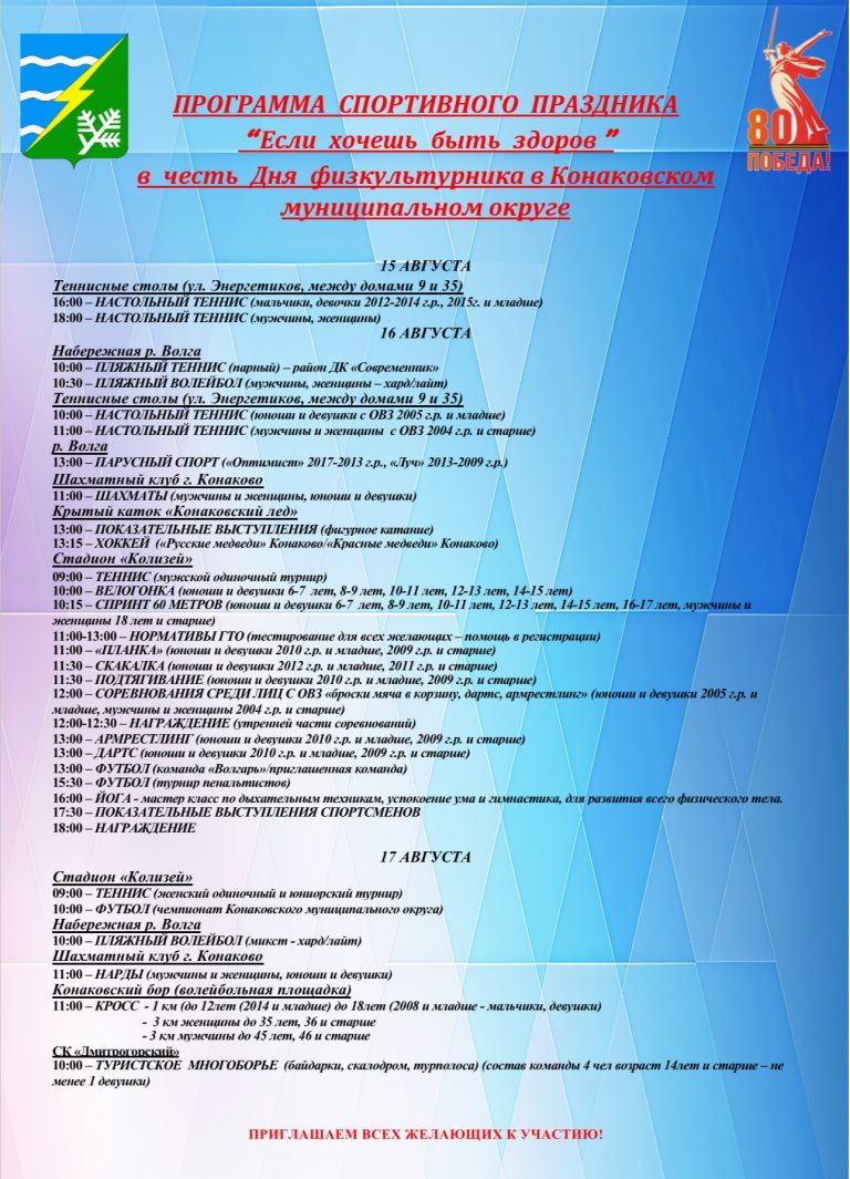 В эти выходные большим количеством мероприятий в Конаковском округе отметят День физкультурника, который отмечался в стране 9 августа.За три дня пройдет множество соревнований. Они начнутся уже в пятницу. Подробности — в афише. 0+ Если вы нашли ошибку, пожалуйста, выделите фрагмент текста и нажмите Ctrl+Enter. 00