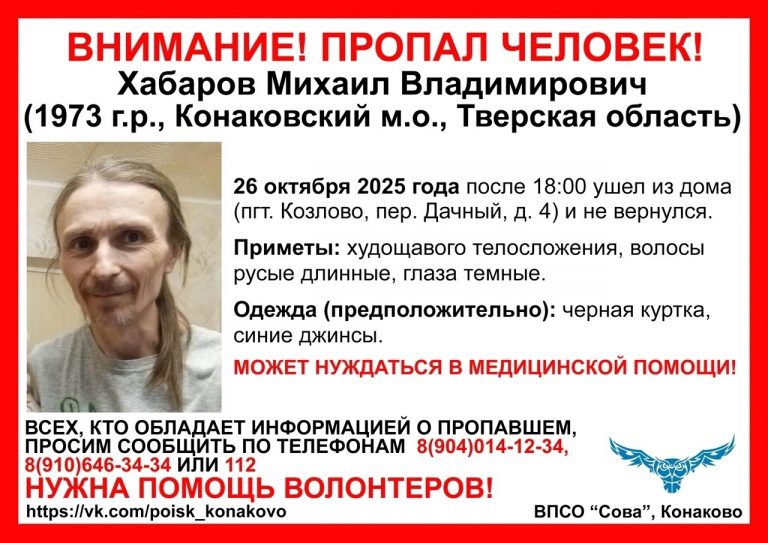 26 октября 2025 года после 18:00 ушел из дома в поселке Козлово (переулок Дачный, д. 4) и не вернулся Хабаров Михаил Владимирович. Полная информация в карточке. Всем, кому известно о местонахождении этого человека или кто его видел после указанной даты, просьба обращаться в ВПСО «Сова» по указанным телефонам.