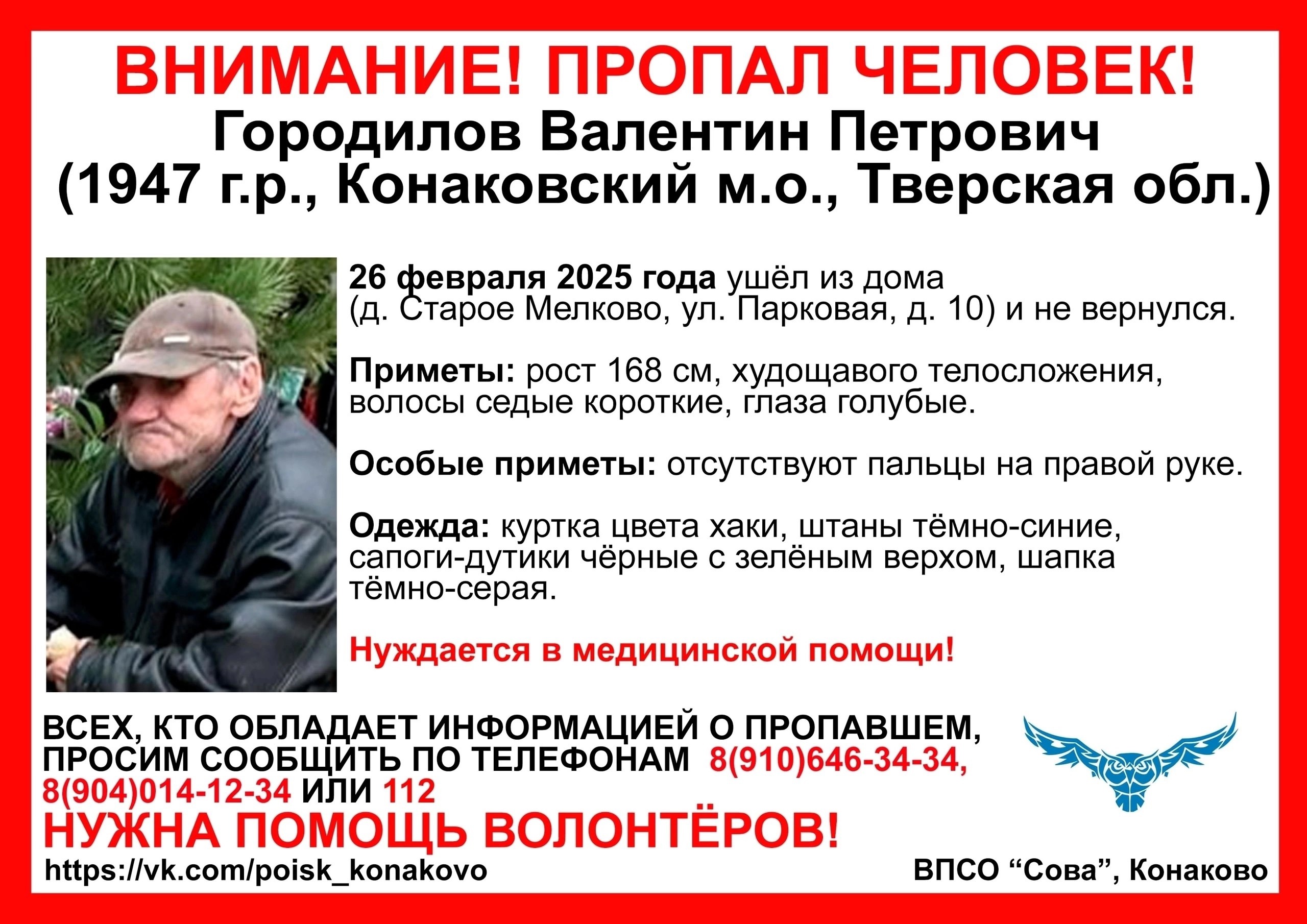 ВПСО "Сова" сообщает, что пропал Городилов Валентин Петрович (1947 г.р., Конаковский м.о., Тверская обл.).