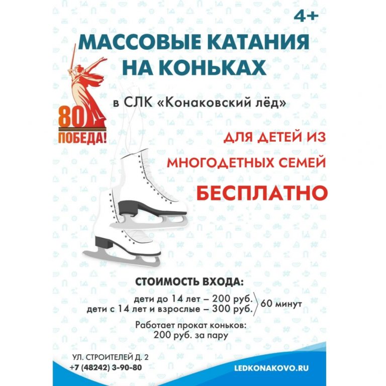 В Конаковском муниципальном округе дети из многодетных семей могут бесплатно покататься на коньках в СЛК «Конаковский лед», по адресу г. Конаково, ул. Строителей, д. 2.