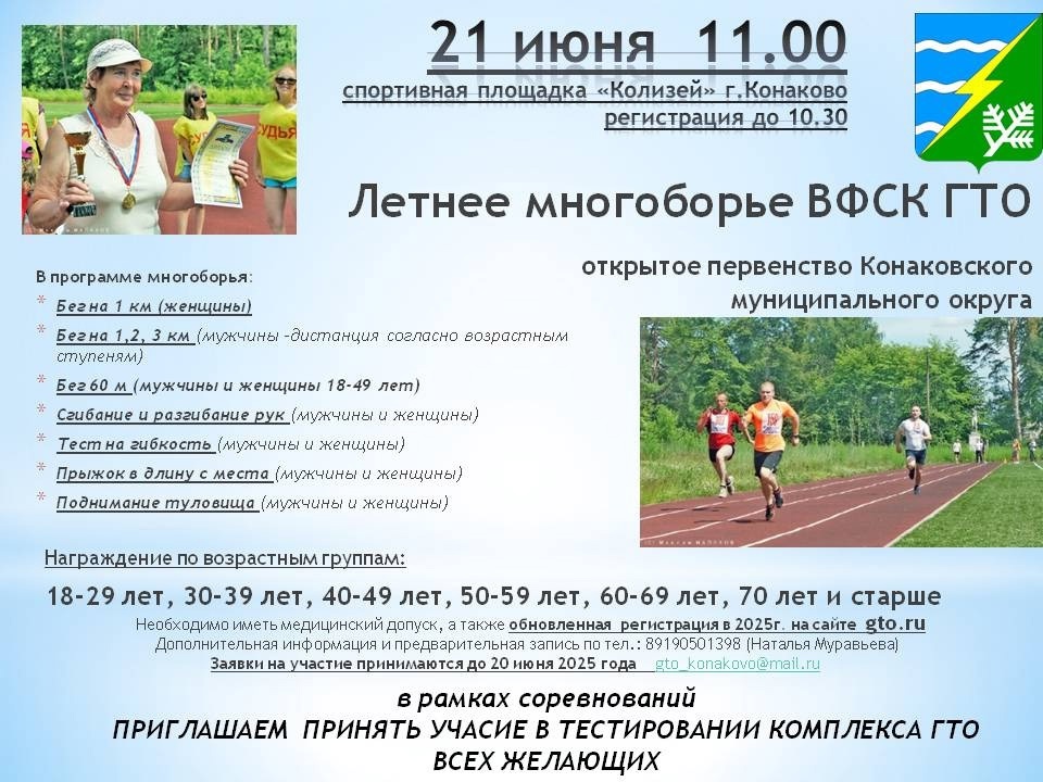 Открытое первенство Конаковского муниципального округа по летнему многоборью ГТО среди взрослых пройдет на спортплощадке стадиона «Колизей» 21 июня. Начало в 11.00. Подробности — в предоставленной МКУ «Спортивный центр», афише. 0+ Если вы нашли ошибку, пожалуйста, выделите фрагмент текста и нажмите Ctrl+Enter. 00