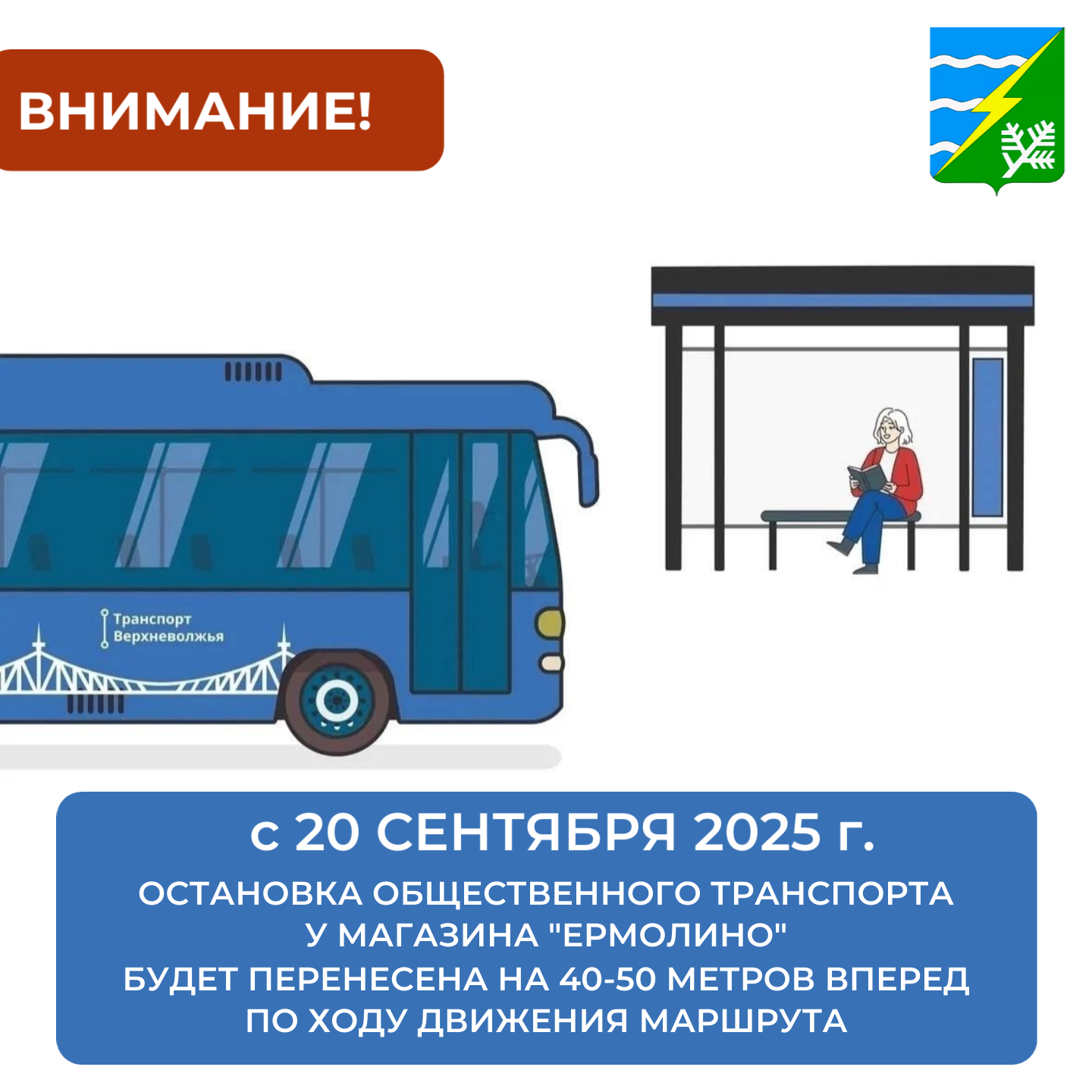 В связи с ремонтом автобусного остановочного павильона у магазина «Ермолино» (остановочный пункт «Торговый центр»), остановка общественного транспорта с 20 сентября будет временно перенесена на 40-50 метров вперед по ходу движения маршрута.