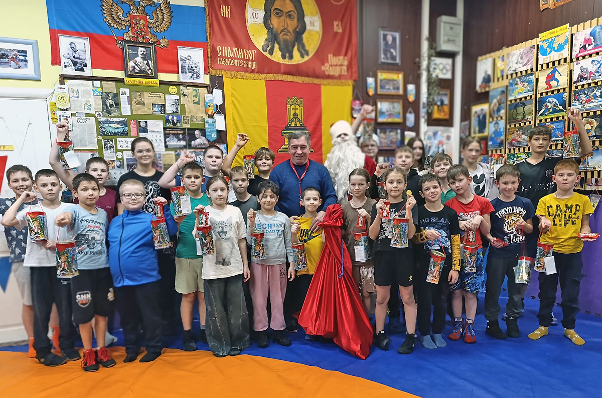 В зале спортивной борьбы села Городня пошло традиционное вручение новогодних подарков команде городенских борцов спортивной школы "Вольная борьба" Конаковского округа.