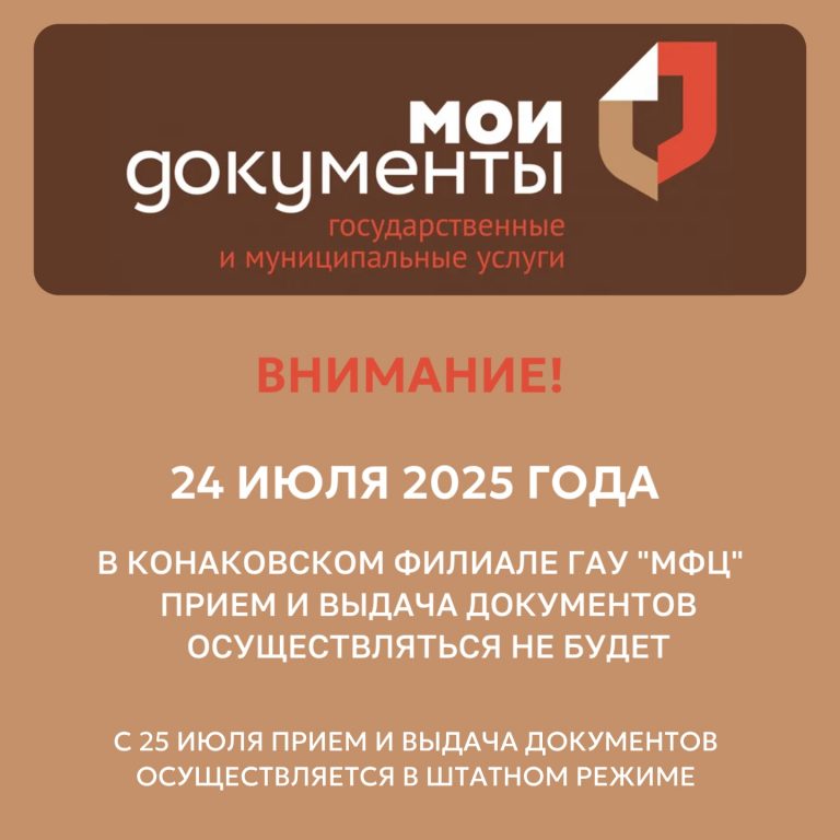 Конаковский филиал ГАУ «МФЦ» информирует о том, что 24 июля 2025 г. не осуществляет прием и выдачу документов по предоставлению государственных и муниципальных услуг.